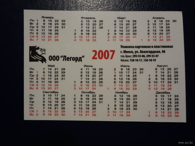 Календарик 2007 г. Легорд. Упакова для пищевых продуктов.