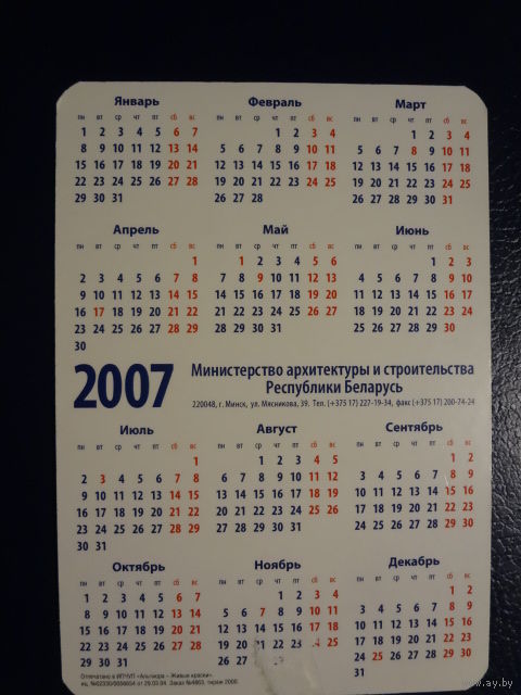 Календарик 2007 г. Министерство архитектуры и строительства РБ.
