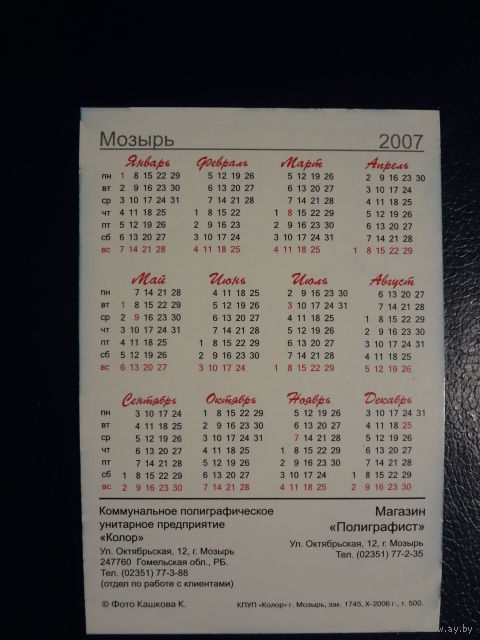 Календарик 2007 г. Мозырь.