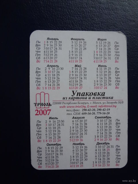 Календарик 2007 г. Упаковка для пищевых продуктов.