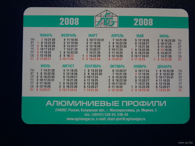 Календарик 2008 г. Агрисовгаз. Алюминиевые профили.