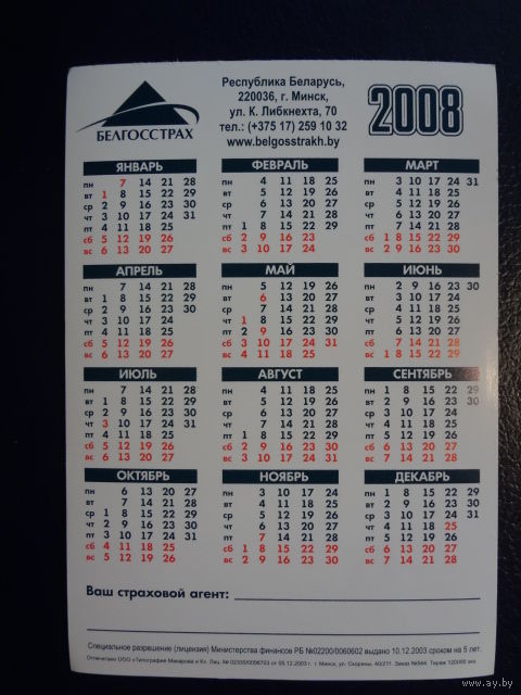 Календарик 2008 г. Белгосстрах. Пакет страховых услуг Новоселам и не только.