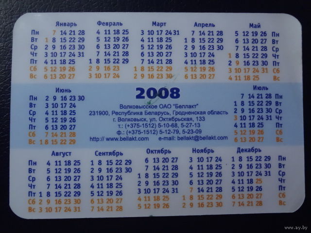 Календарик 2008 г. Беллакт. Вместе с рождения! (Волковыск).