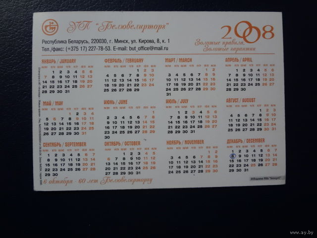Календарик 2008 г. Белювелирторг.