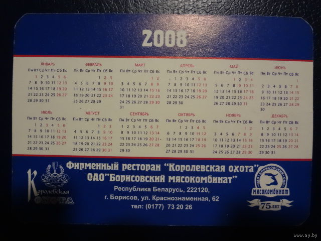 Календарик 2008 г. Фирменный ресторан Королевская охота. (Борисов).