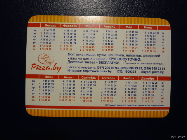 Календарик 2008 г. Pizza.by Доставка заказа - БЕСПЛАТНО!
