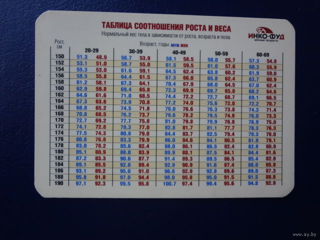 Календарик 2008 г. Таблица соотношения роста и веса.