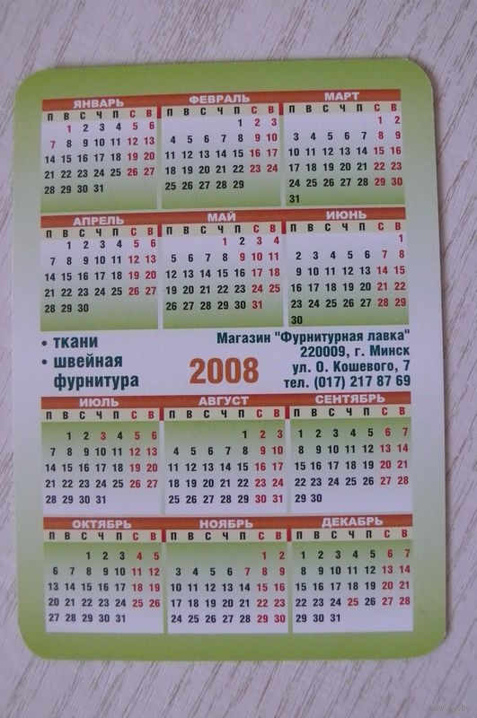 Календарик, 2008, Магазин "Фарнитурная лавка", изд. Минск.