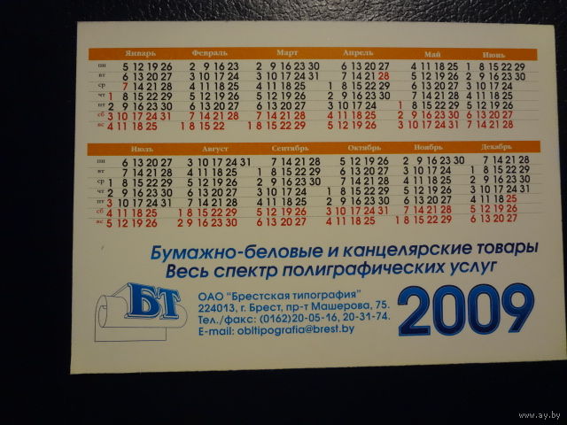 Календарик 2009 г. Брестская типография. Брестская крепость.