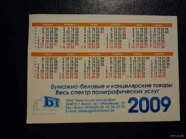 Календарик 2009 г. Брестская типография. Подсолнухи.