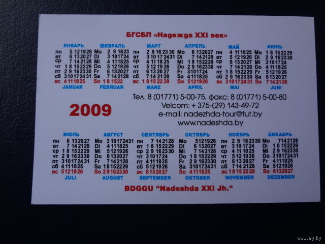 Календарик 2009 г. Филиал образовательных и туристических услуг "Надежда-тур".