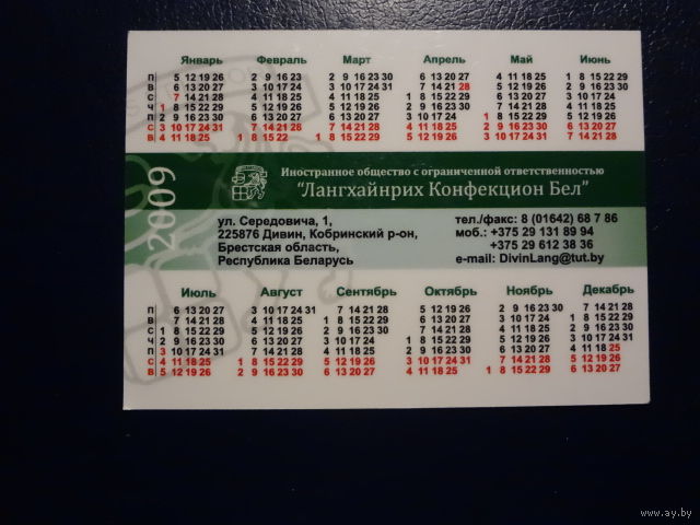 Календарик 2009 г. Лангхайнрих Конфекцион Бел. Текстиль. (Дивин, Кобринский р-он).