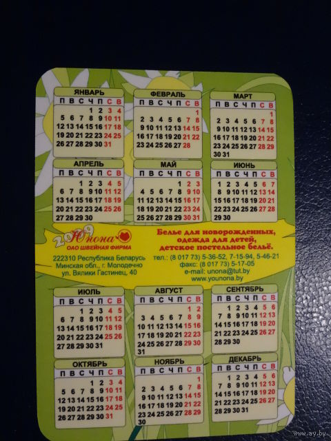 Календарик 2009 г. Швейная фабрика Юнона (Молодечно).