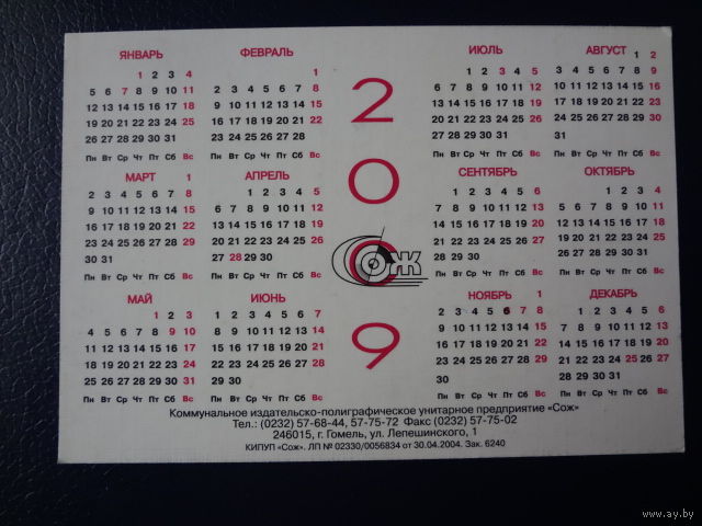 Календарик 2009 г. СОЖ. г. Гомель. Полиграфия.