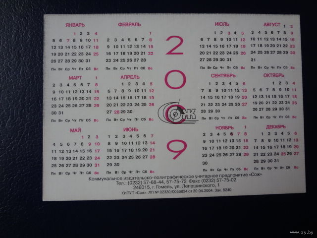 Календарик 2009 г. СОЖ. г. Гомель. Полиграфия.