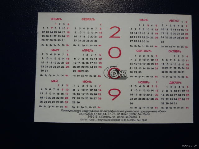 Календарик 2009 г. СОЖ (Гомель). Автомобиль.