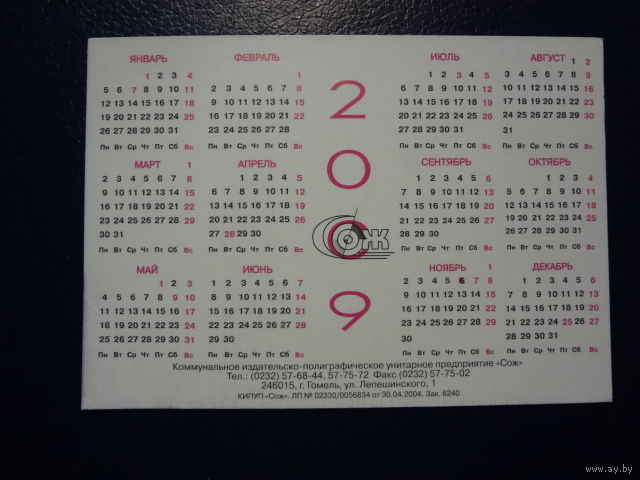 Календарик 2009 г. СОЖ (Гомель). Тюльпаны.