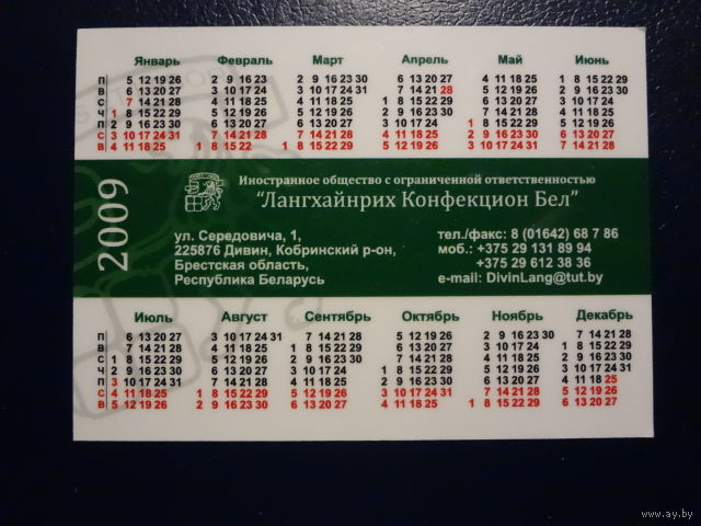 Календарик 2009 г. Текстиль. Лангхайнрих Конфекцион Бел. (Дивин, Кобринский р-он).
