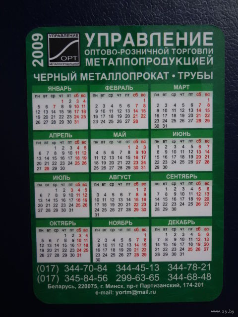 Календарик 2009 г. Управление ОРТ металлопродукцией.