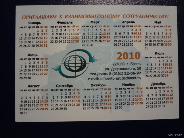 Календарик 2010 г. Белтаможсервис. Брестский филиал.