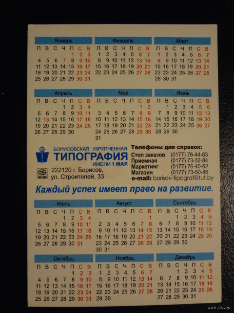 Календарик 2010 г. Борисовская типография.