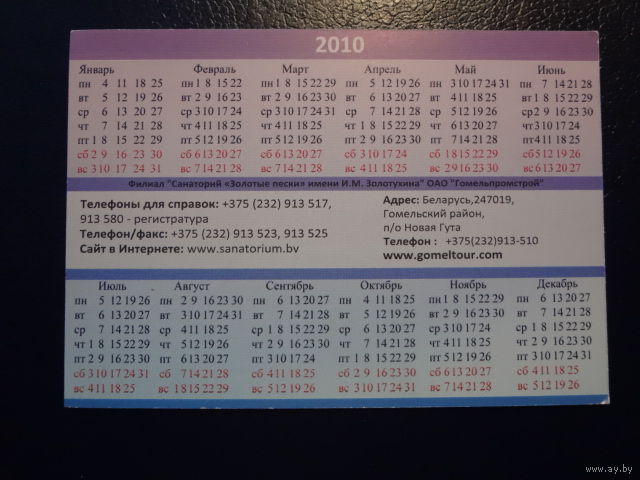 Календарик 2010 г. Санаторий Золотые пески (Гомельский р-он).