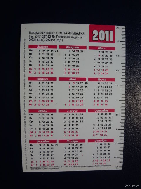 Календарик 2011 г. Белорусский журнал Охота и рыбалка.