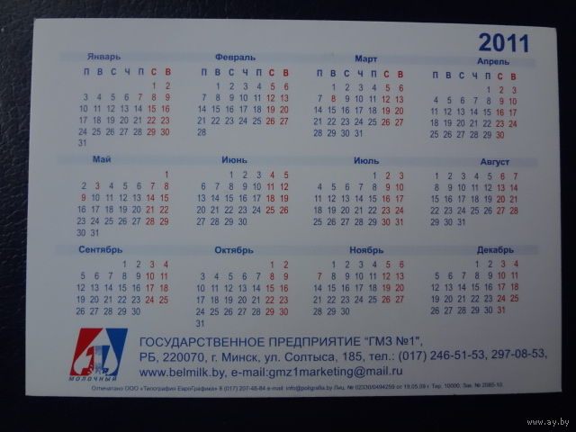Календарик 2011 г. Городской молочный завод 1.