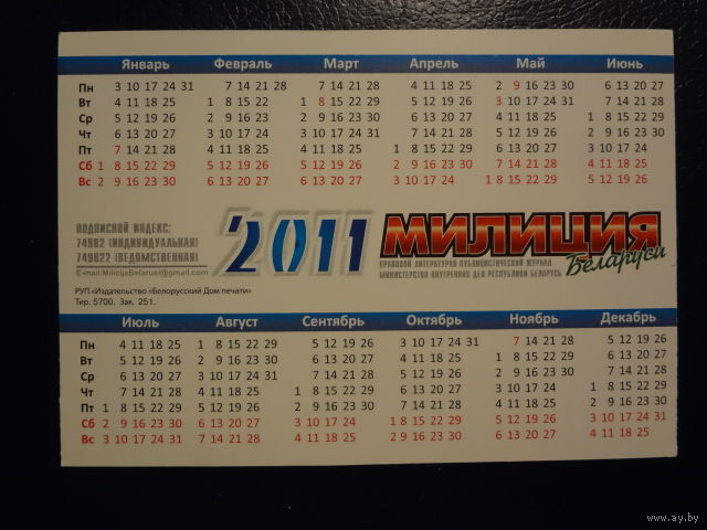 Календарик 2011 г. Милиция Беларуси. Журнал. Автомобиль саперов.
