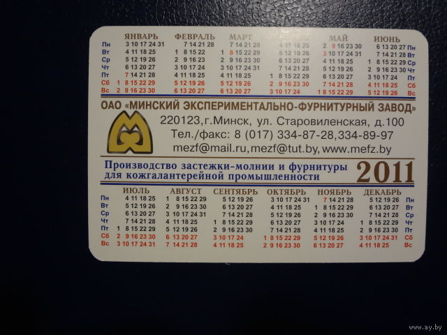 Календарик 2011 г. Минский экспериментально-фурнитурный завод.