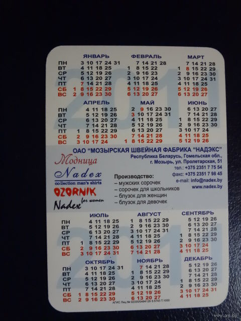 Календарик 2011 г. Nadex. (Мозырь).