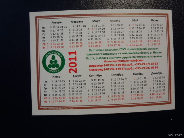 Календарик 2011 г. Охотничий комплекс Новогрудский лесхоз.