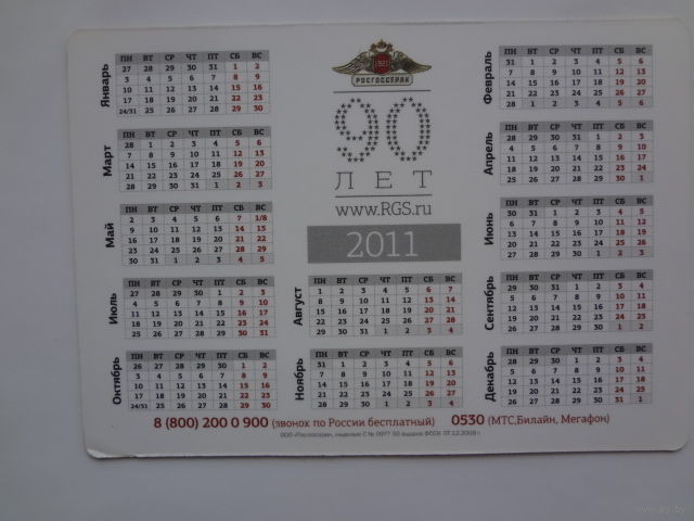 Календарик 2011 г. Росгосстрах. 90 лет. Страхование средств транспорта.