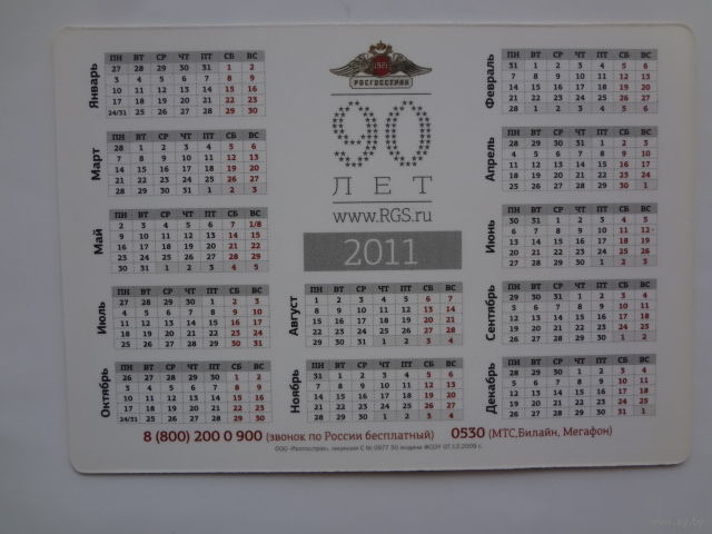 Календарик 2011 г. Росгосстрах. 90 лет. Страхование жизни.