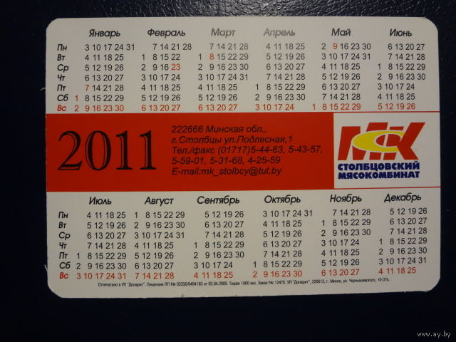 Календарик 2011 г. Столбцовский мясокомбинат. 65 лет.