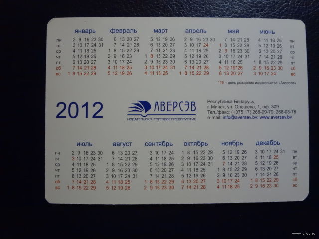 Календарик 2012 г. Аверсэв. Издательско-торговое предприятие.
