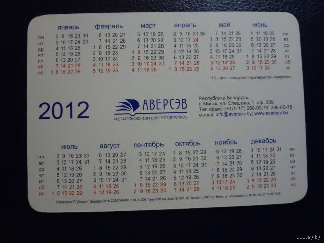 Календарик 2012 г. Аверсэв. Весь спектр учебной литературы!