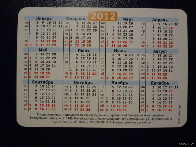 Календарик 2012 г. Березинский биосферный заповедник. Гостиничный комплекс Сергуч.