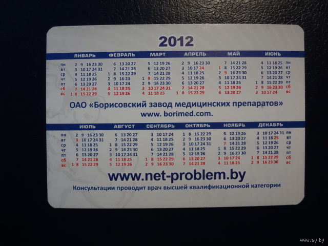 Календарик 2012 г. Борисовский завод медицинских препаратов.