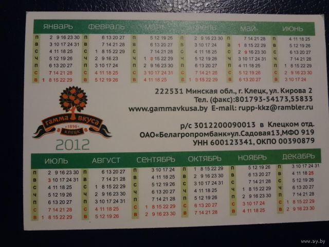 Календарик 2012 г. Гамма вкуса (Клецк). 115 лет качества.