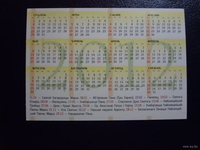 Календарик 2012 г. Хрысціянская кнігарня Духоўная кніга.