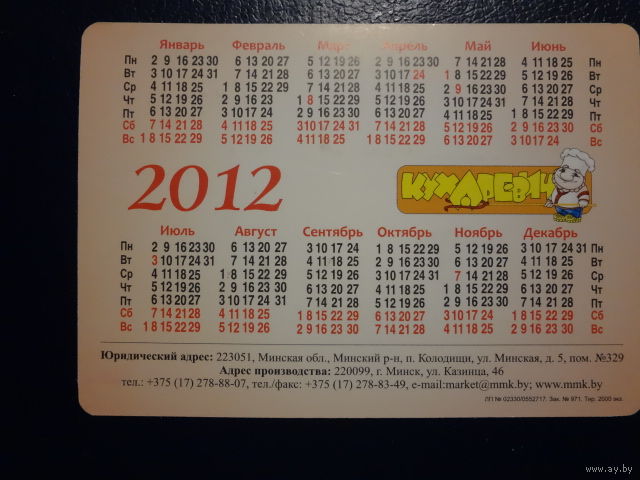 Календарик 2012 г. Минский мясокомбинат. Кухаревича еда Вас порадует всегда!