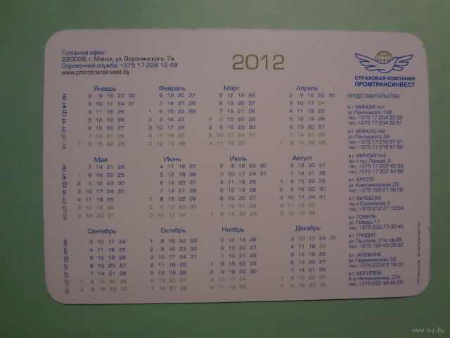 Календарик 2012 г. ПромТрансИнвест. Самолет.