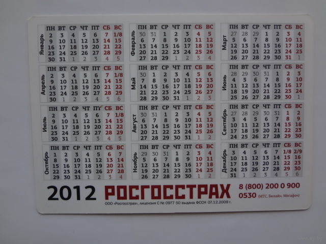 Календарик 2012 г. Росгосстрах. Страхование от несчастных случаев.