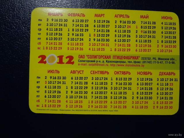 Календарик 2012 г. Солигорская птицефабрика. Яйца Молодецкие.