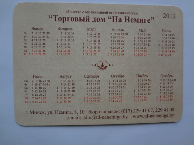 Календарик 2012 г. ТД На Немиге. Лучшее место для покупок и встреч!