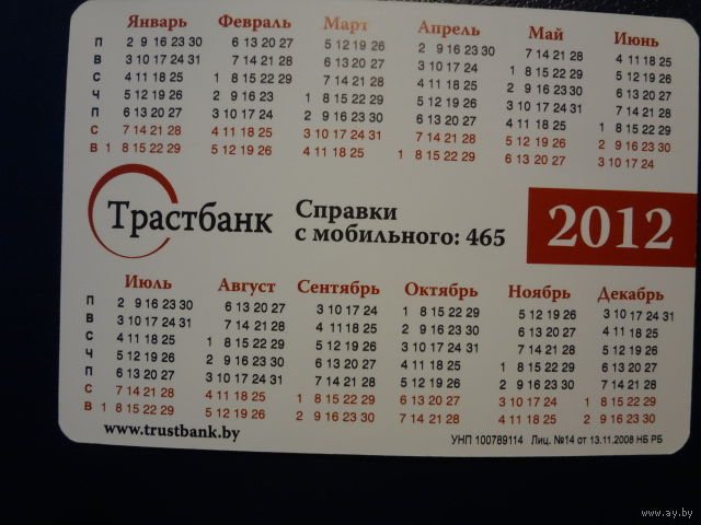 Календарик 2012 г. Трастбанк. Быстрые кредиты за 1 час.