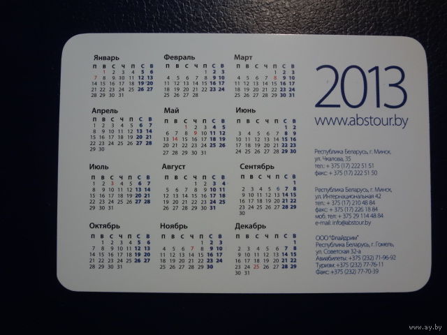 Календарик 2013 г. АэроБелСервис. Компания для отдыха.