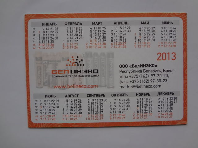 Календарик 2013 г. БелИНЭКО. Сохраним тепло вашего дома.