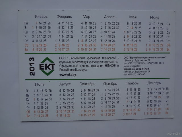 Календарик 2013 г. Hitachi. Европейские крепежные технологии.